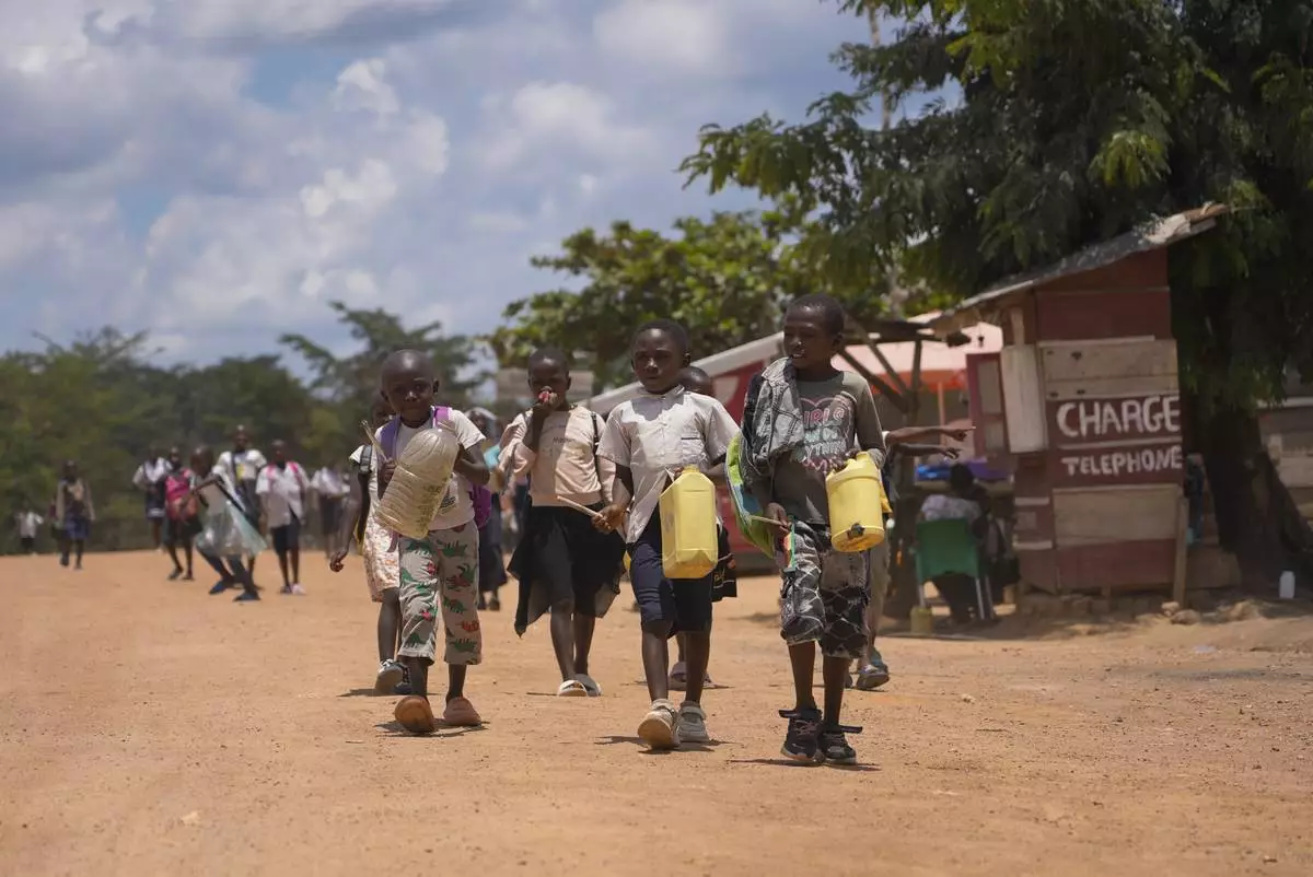 Children walk and play music on plastic jugs at the Epulu village in the Okapi Wildlife Reserve in Congo, Sept. 21, 2024. (AP Photo/Sam Mednick)