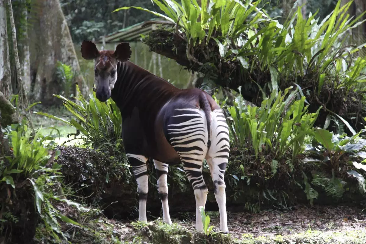In this undated photo, an okapi stands in a protected area as part of a captive breeding program in the Okapi Wildlife Reserve in Congo. (Okapi Conservation Project via AP)