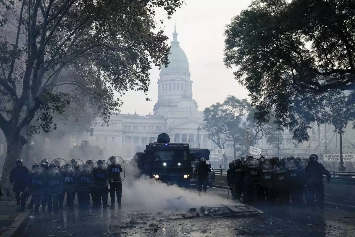 FILE - Police clear the streets during clashes with anti-government protesters outside Congress, where lawmakers debate a reform bill promoted by President Javier Milei in Buenos Aires, Argentina, June 12, 2024. (AP Photo/Rodrigo Abd, File)
