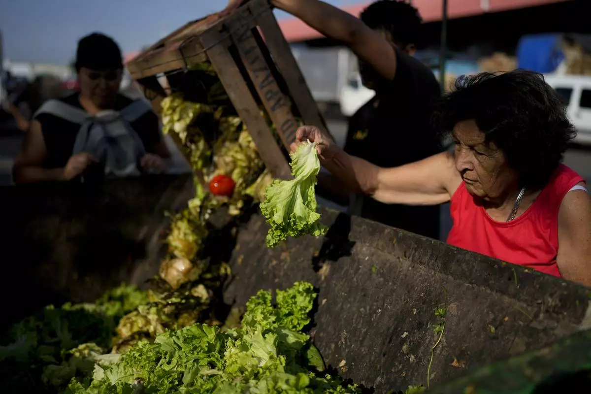 FILE - A woman culls through produce discarded by vendors at a market on the outskirts of Buenos Aires, Argentina, Jan. 10, 2024. Argentine President Javier Milei has scrapped price controls and slashed subsidies, causing prices to skyrocket in a country that already had among the world's highest inflation rates. (AP Photo/Natacha Pisarenko, File)