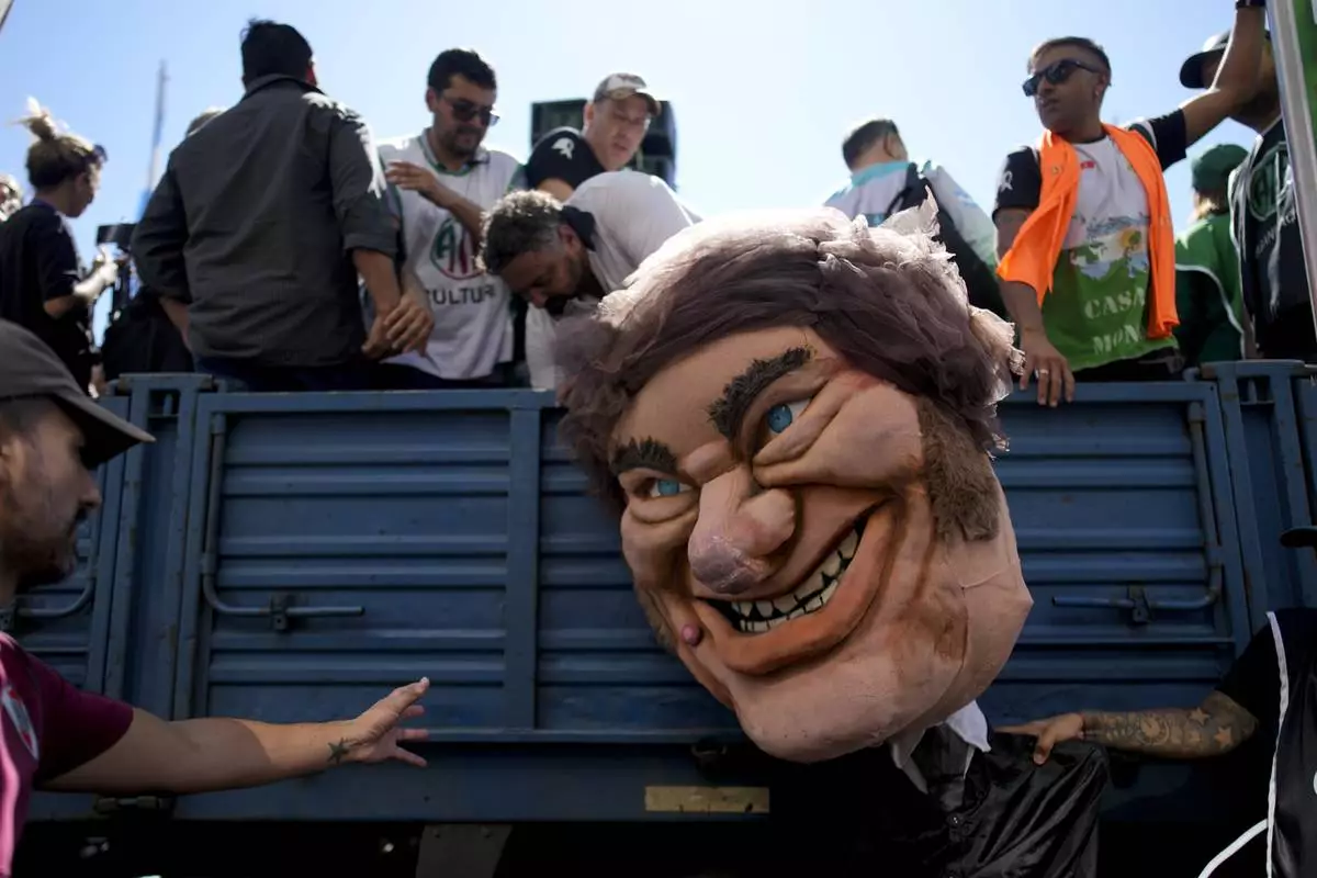 FILE - A demonstrator holds a giant doll depicting President Javier Milei during a protest demanding the reincorporation of state workers laid off as part of state economic downsizing measures in Buenos Aires, Argentina, April 5, 2024. (AP Photo/Natacha Pisarenko, File)