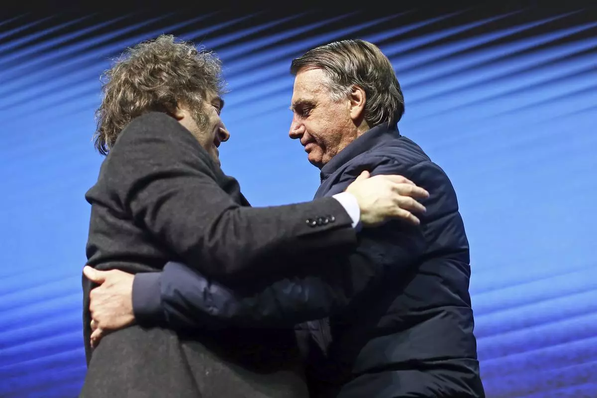 FILE - Argentina's President Javier Milei, left, hugs Brazilian former President Jair Bolsonaro during CPAC Brasil 2024, a conservative event, in Balneario Camboriu, Santa Catarina state, Brazil, July 7, 2024. (AP Photo/Heuler Andrey, File)