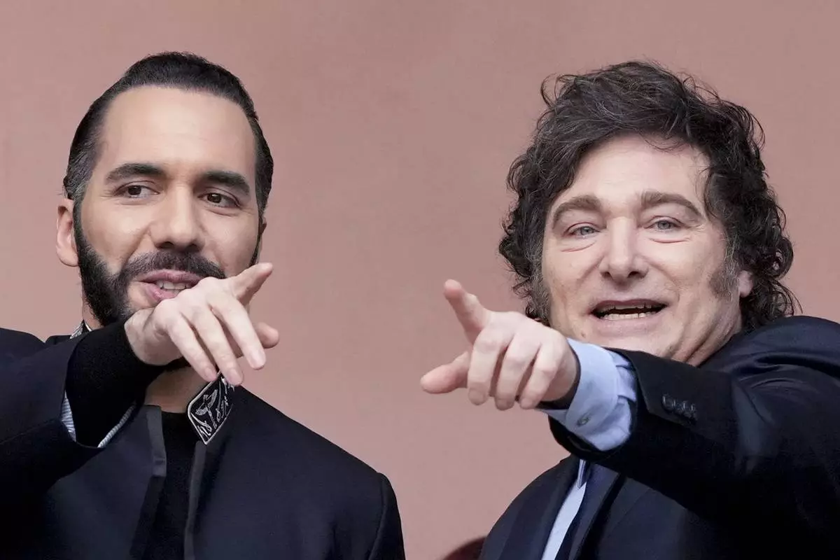 FILE - Argentine President Javier Milei, right, and El Salvador's President Nayib Bukele point from a balcony during Bukele's visit to the government house in Buenos Aires, Argentina, Sept. 30, 2024. (AP Photo/Natacha Pisarenko, File)