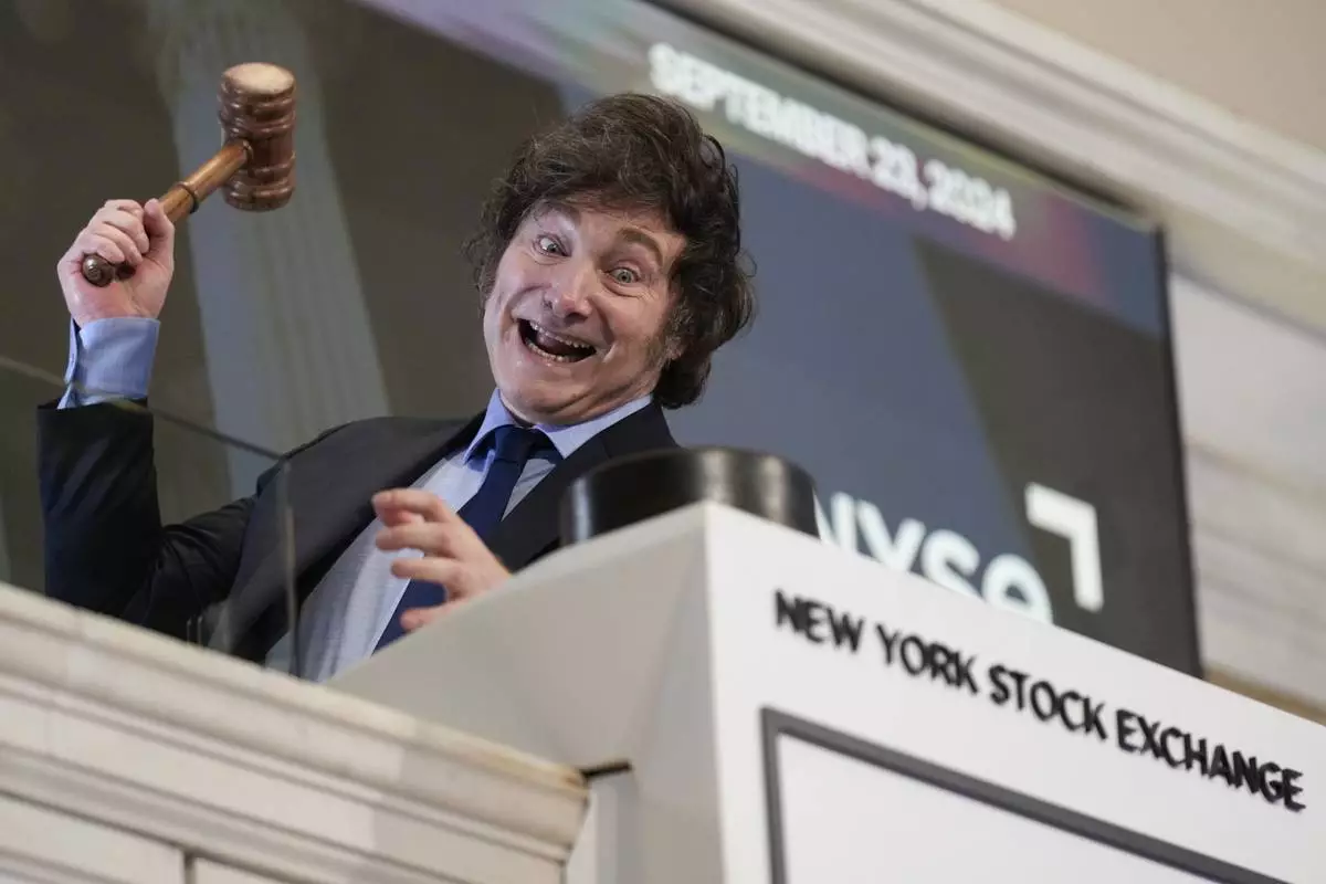FILE - Argentina's President Javier Milei poses for pictures after ringing the opening bell at the New York Stock Exchange in New York, Sept. 23, 2024. (AP Photo/Seth Wenig, File)