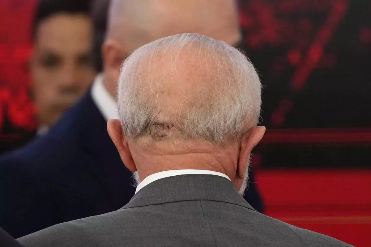 The back of Brazilian President Luiz Inacio Lula da Silva's head shows stitches resulting from a fall, during an event at Planalto Presidential Palace in Brasilia, Brazil, Friday, Oct. 25, 2024. (AP Photo/Eraldo Peres)