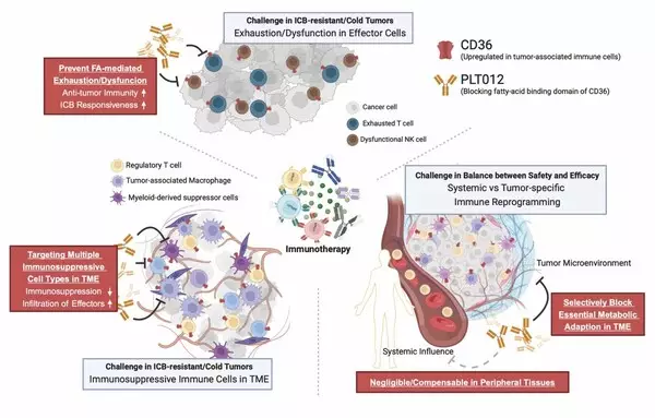 PLT012, is a humanized anti-CD36 antibody with a unique dual mechanism of action (MOA): it simultaneously disarms immunosuppressive cell populations and amplifies effector T cell functions. PLT012 has shown potential against multiple tumors with unmet medical needs. It is set to advance to its first U.S. IND submission and first patient dosing in 2025. As a monotherapy, PLT012 demonstrates remarkable anti-tumor efficacy in both immune 'hot' and 'cold' tumor models with a significant augmentation in GzmB-expressing CD8+ T cells and reductions in both intratumoral Tregs and pro-tumorigenic macrophage. Additionally, PLT012 treatment alters the exhaustion features of cytotoxic CD8+ T cells by increasing the populations of progenitor- (Texprog) and tumoricidal activities in terminal-exhausted T cells (Texterm), highlighting enhanced anti-tumor immunity when combined with immune checkpoint blockade therapies, such as PD-1 or PD-L1 inhibitors.