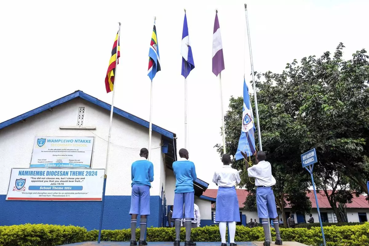 Students lower flags at Wampewo Ntakke Secondary School in Kawempe tula village, Kampala, Uganda on Nov. 4, 2024. (AP Photo/Hajarah Nalwadda)