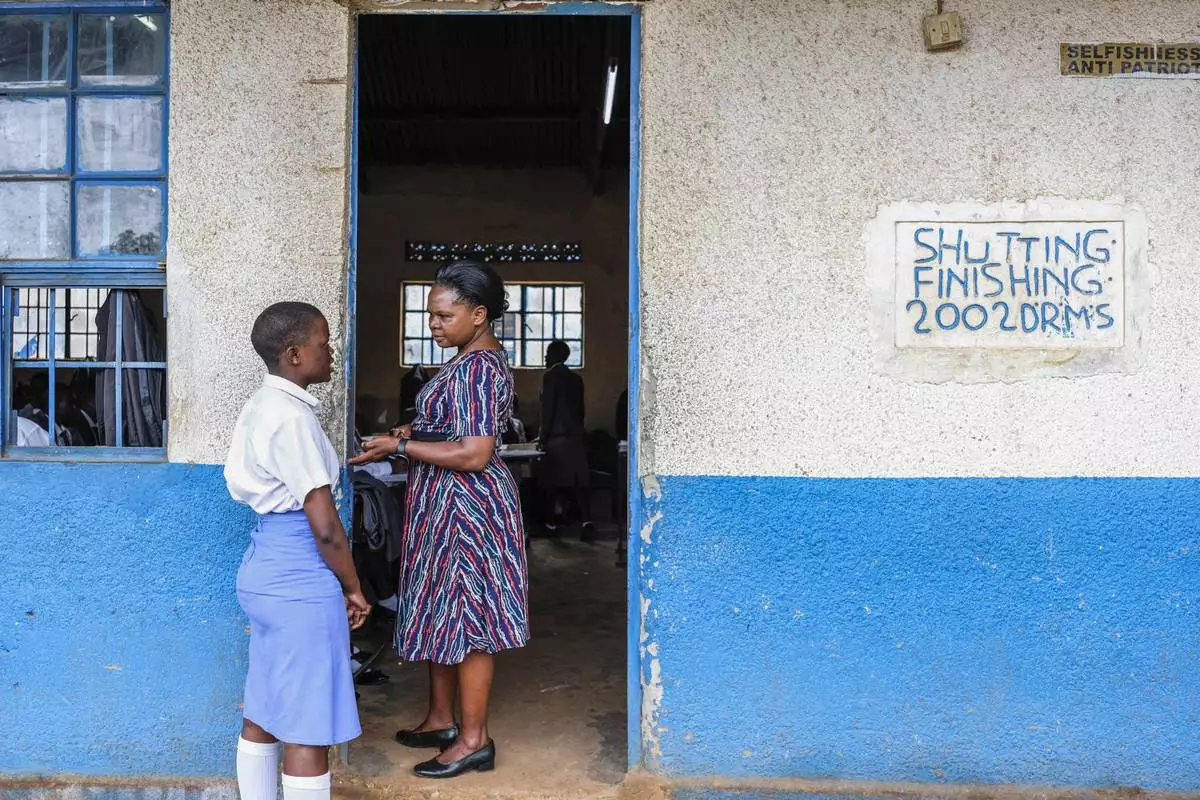 A teacher talks to her student at Wampewo Ntakke Secondary School in Kawempe tula village, in Kampala, Uganda on Nov. 4, 2024. (AP Photo/Hajarah Nalwadda)
