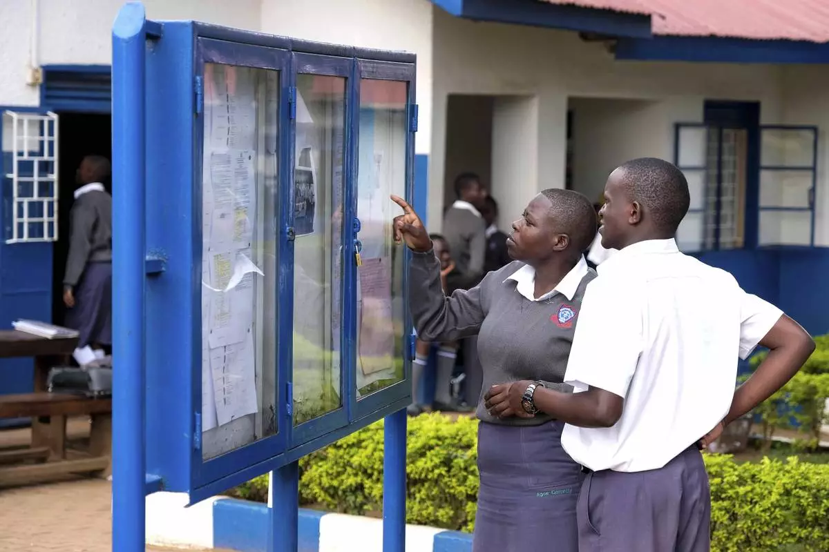 Students look on a school notice board at Wampewo Ntakke Secondary School in Kawempe tula village, in Kampala, Uganda on Nov. 4, 2024. (AP Photo/Hajarah Nalwadda)