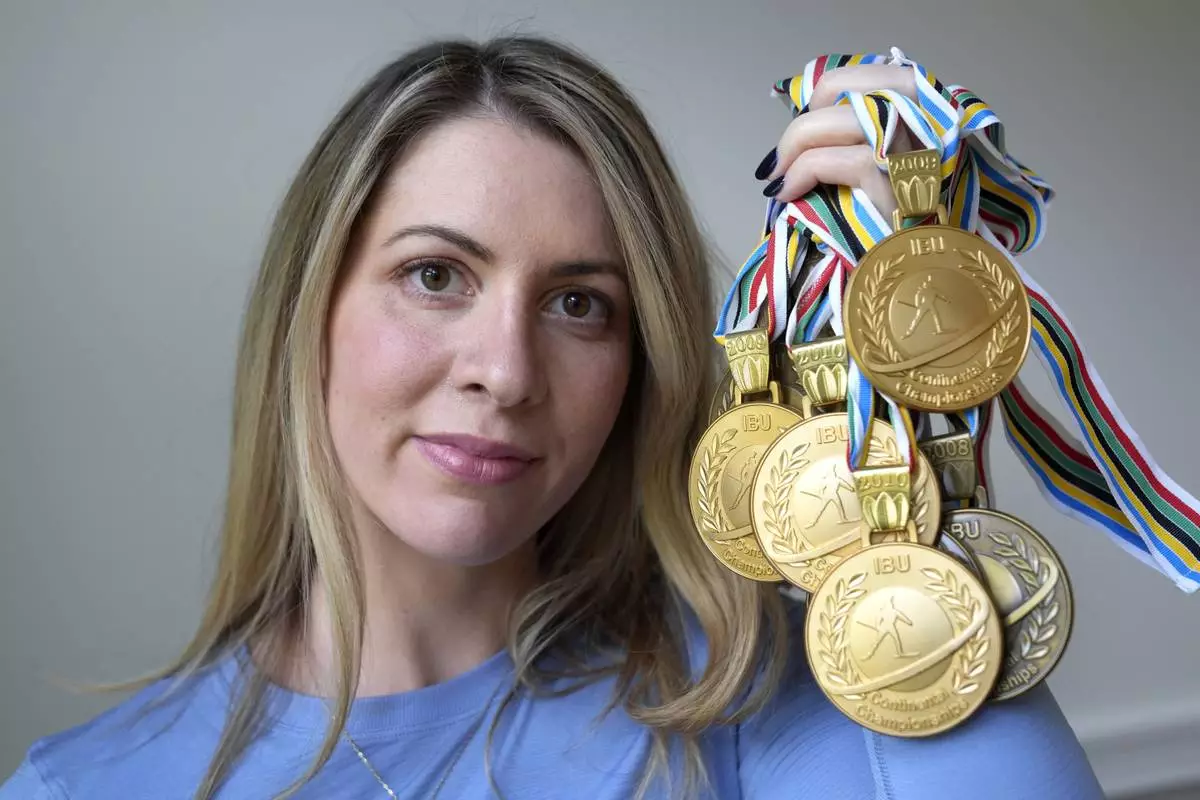 Grace Boutot, who won a silver medal in the Youth World Championships in 2009, displays a few of her medals from competitions, Oct. 17, 2024, at her home in Boston. (AP Photo/Steven Senne)