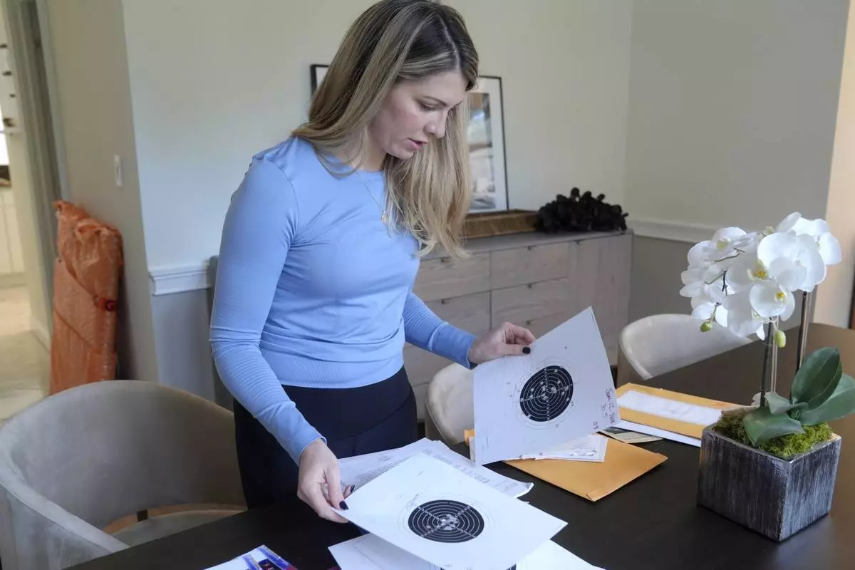 Grace Boutot, who won a silver medal in the Youth World Championships in 2009, displays targets from her time as a biathlon competitor, at her home in Boston, Oct. 17, 2024. (AP Photo/Steven Senne)