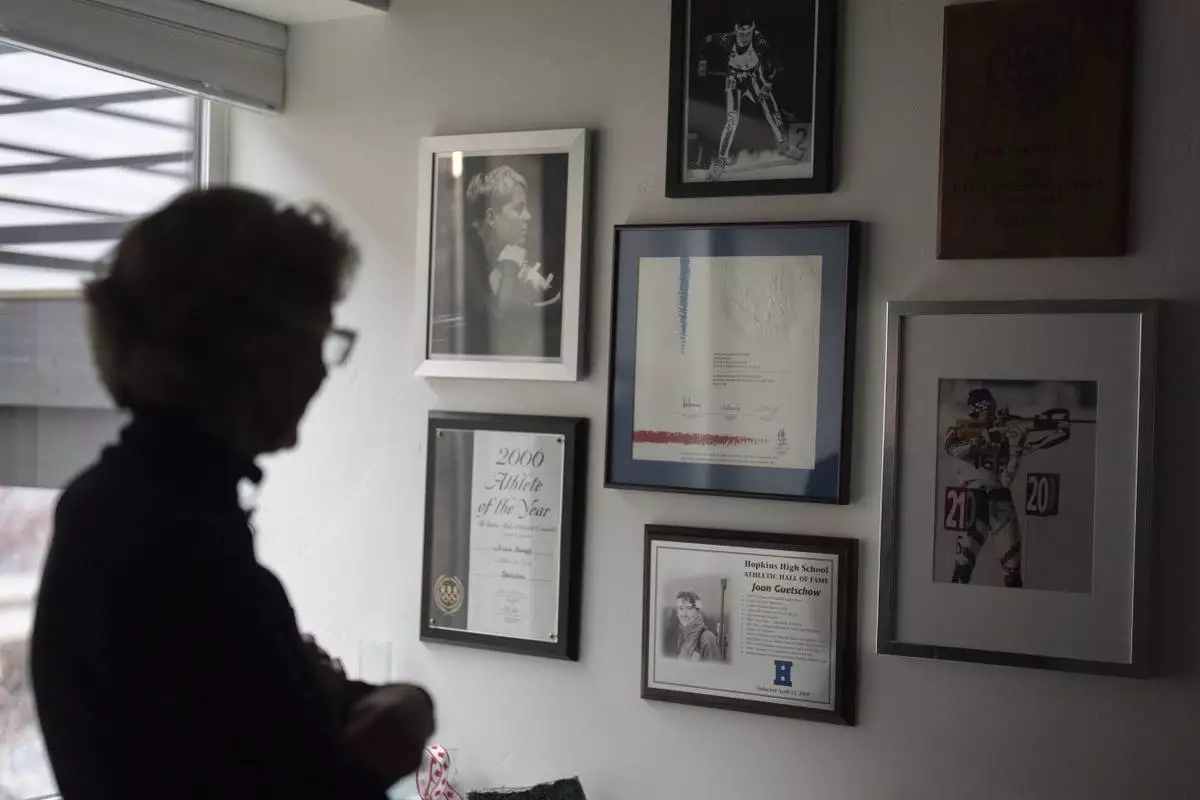 Two-time Olympian Joan Wilder looks at memorabilia at her home on Nov. 22, 2024, in Bend, Ore., including an image of her competing at bottom right. (AP Photo/Jenny Kane)