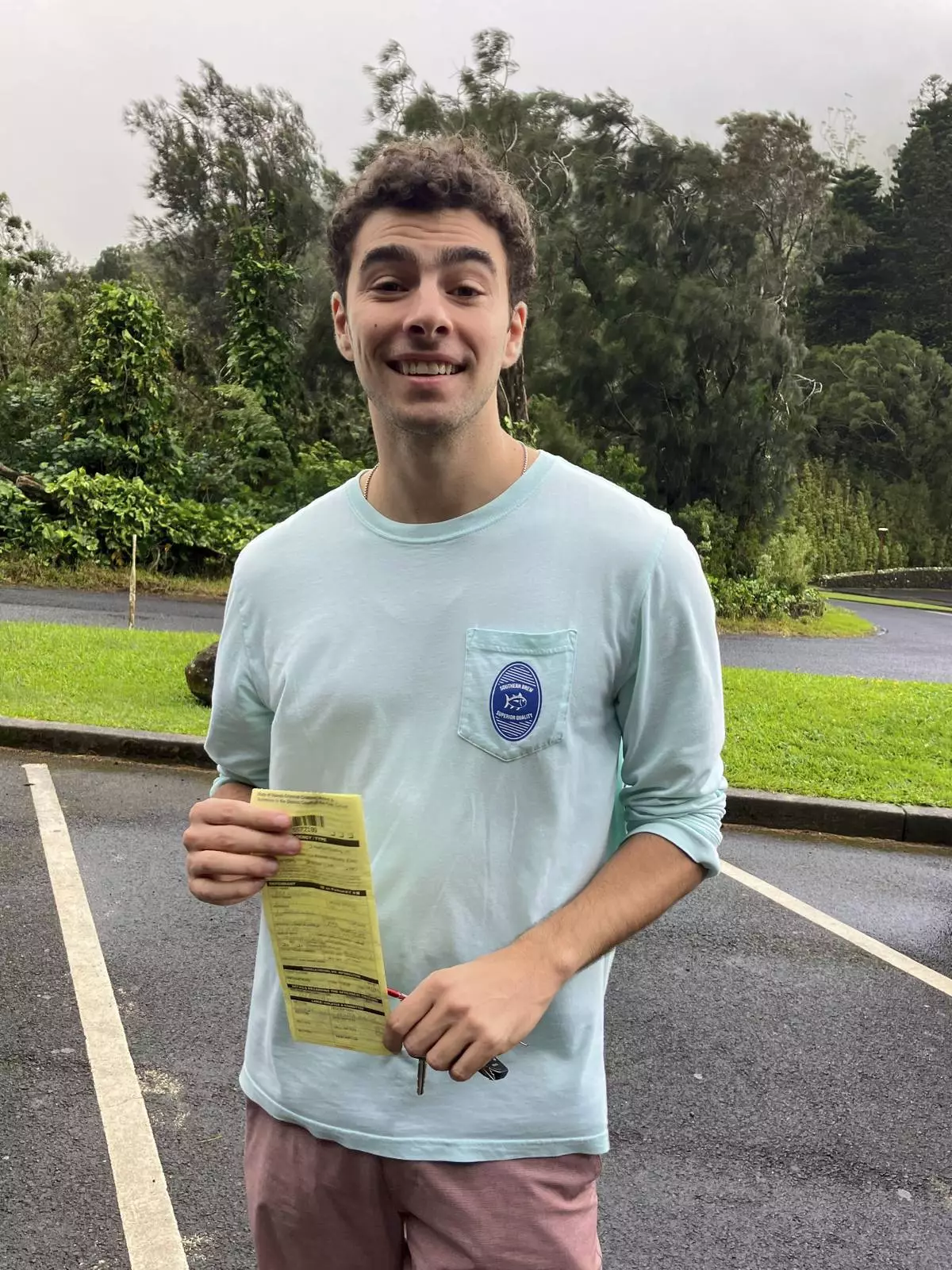 This photo, provided by the Hawaii Dept. of Land and Natural Resources, shows Luigi Mangione, a suspect in the fatal shooting of UnitedHealthcare CEO Brian Thompson, receiving a citation for failing to observe a posted closed-area sign, in Honolulu, Sunday, Nov. 12, 2023. (Hawaii Dept. of Land and Natural Resources via AP)