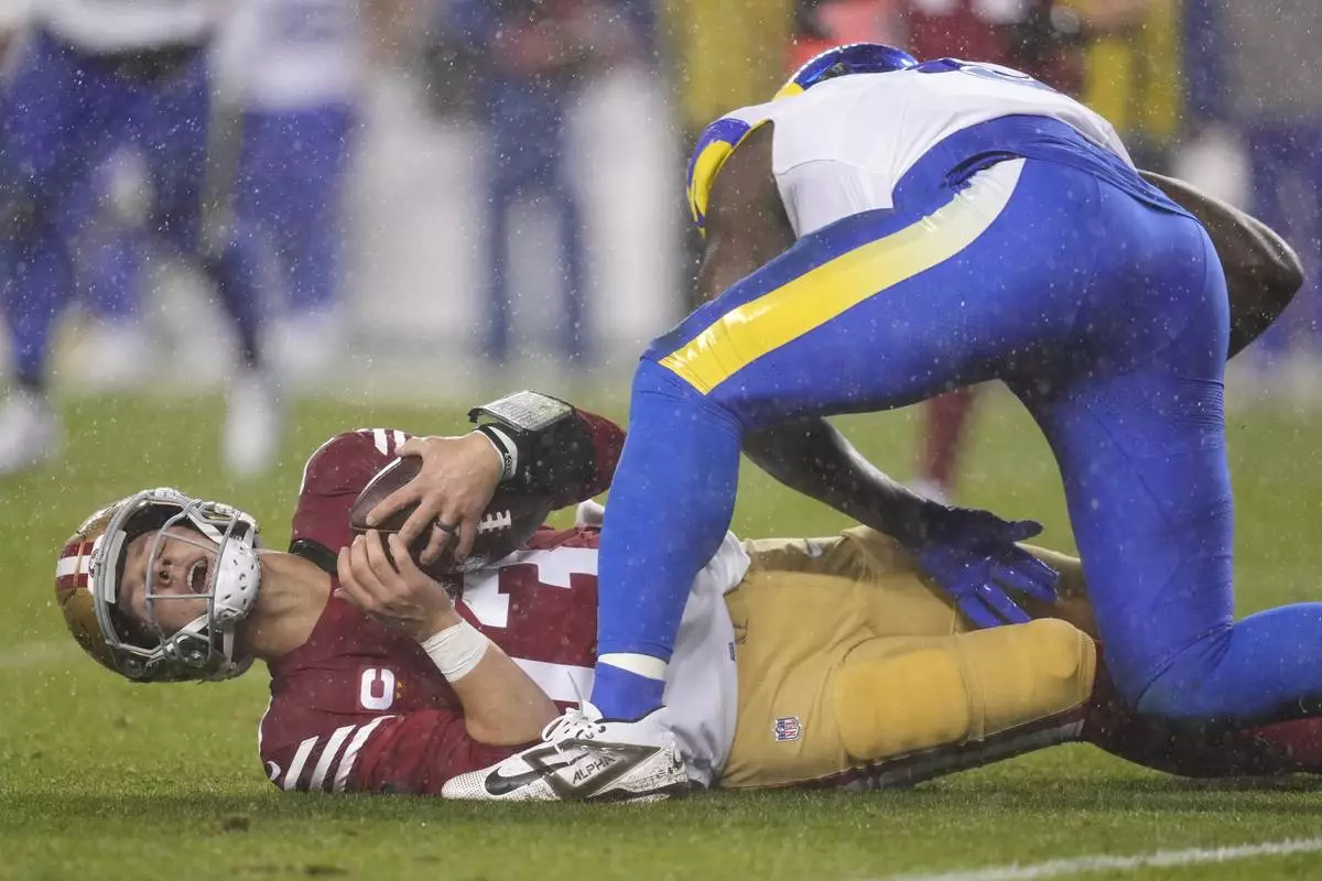 San Francisco 49ers quarterback Brock Purdy, bottom, reacts after being sacked by Los Angeles Rams defensive tackle Kobie Turner, top, during the first half of an NFL football game in Santa Clara, Calif., Thursday, Dec. 12, 2024. (AP Photo/Godofredo A. Vásquez)