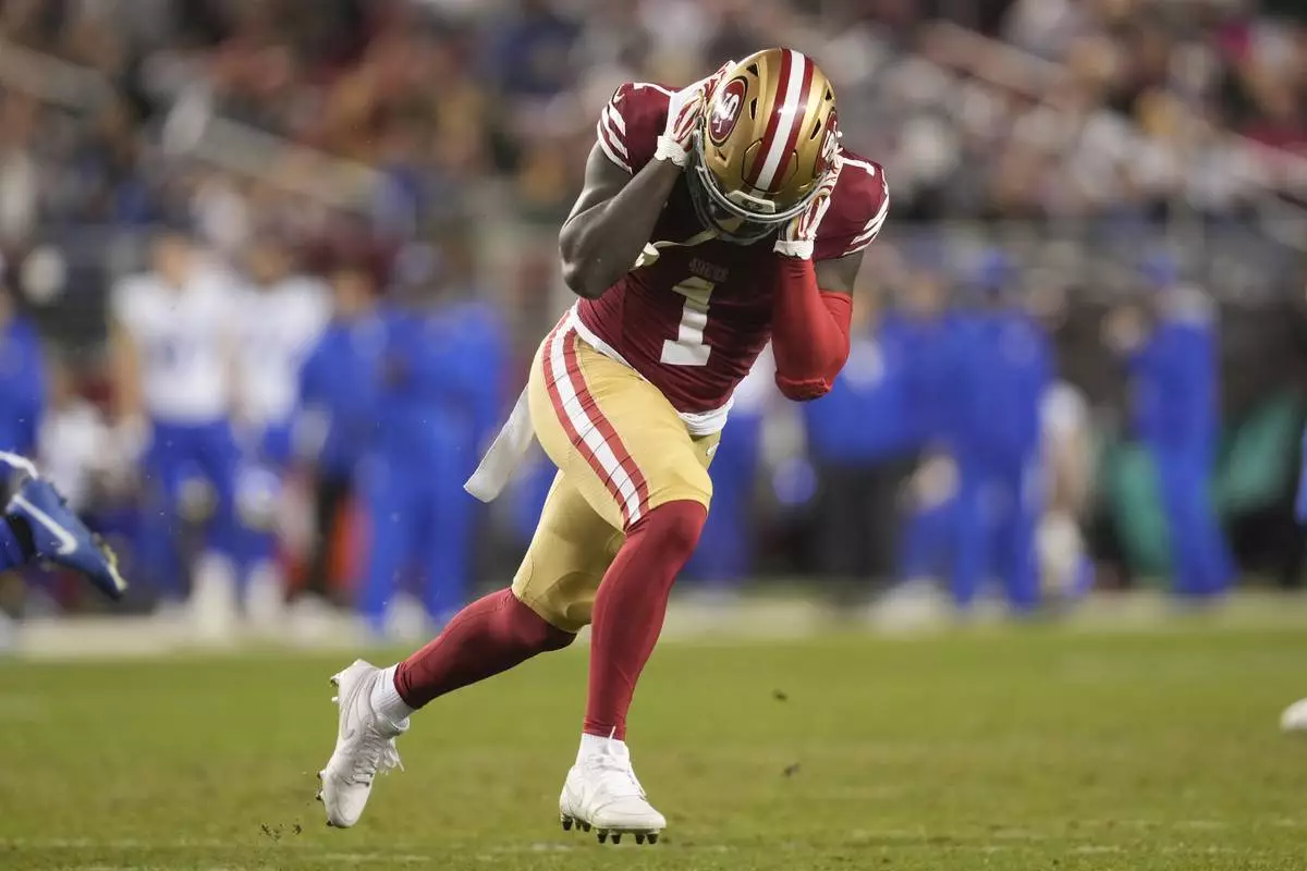 San Francisco 49ers wide receiver Deebo Samuel Sr. (1) runs against the Los Angeles Rams during the second half of an NFL football game in Santa Clara, Calif., Thursday, Dec. 12, 2024. (AP Photo/Godofredo A. Vásquez)