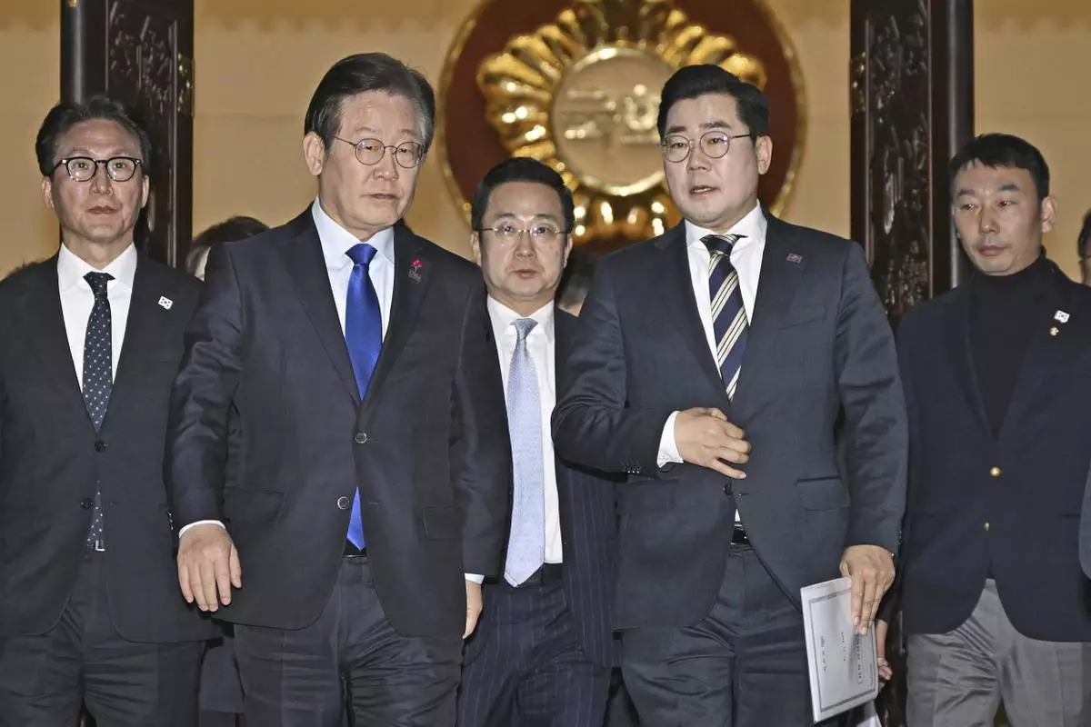 South Korea's main opposition Democratic Party leader Lee Jae-myung, front left, and its floor leader Park Chan-dae, front right, leave a room at the National Assembly in Seoul after South Korea’s parliament voted to impeach President Yoon Suk Yeol Saturday, Dec. 14, 2024. (Kyodo News via AP)