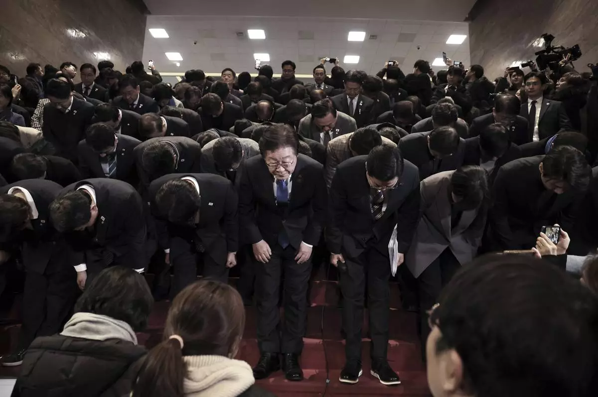 South Korea's main opposition Democratic Party leader Lee Jae-myung, bottom center, and his party members bow at the National Assembly in Seoul, South Korea, after South Korea’s parliament voted to impeach President Yoon Suk Yeol Saturday, Dec. 14, 2024. (Kim Ju-hyung/Yonhap via AP)