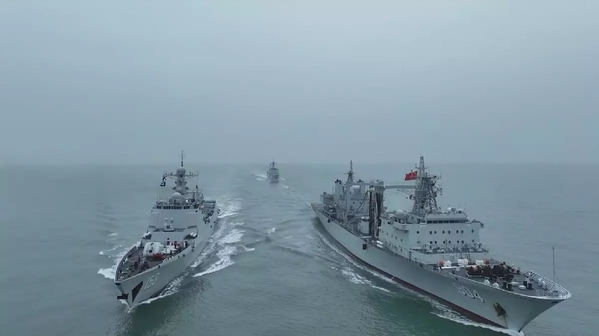 The escort fleet is composed of guided-missile destroyer Baotou, guided-missile frigate Honghe, and comprehensive supply ship Gaoyouhu from the Eastern Theater Command.