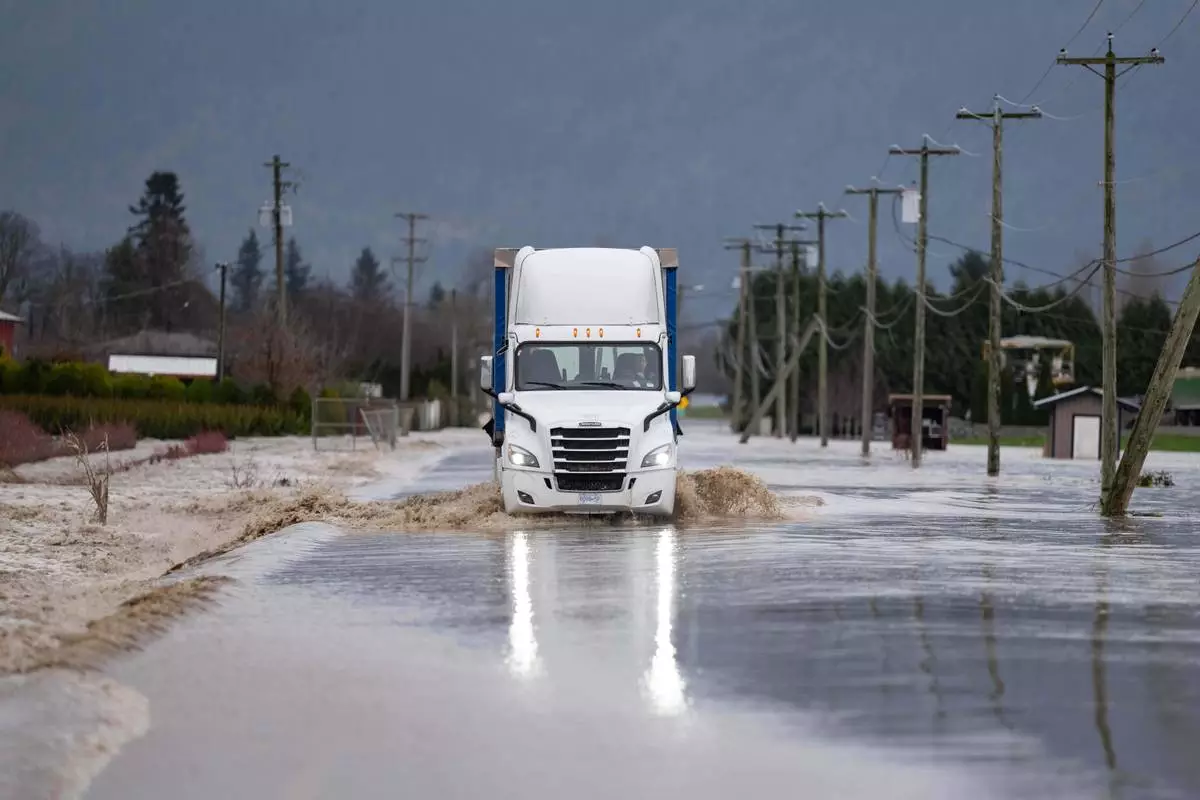 A semi-truck crosses a flooded street in Abbotsford, British Columbia, on Thursday, Dec. 11, 2025. (Ethan Cairns/The Canadian Press via AP)