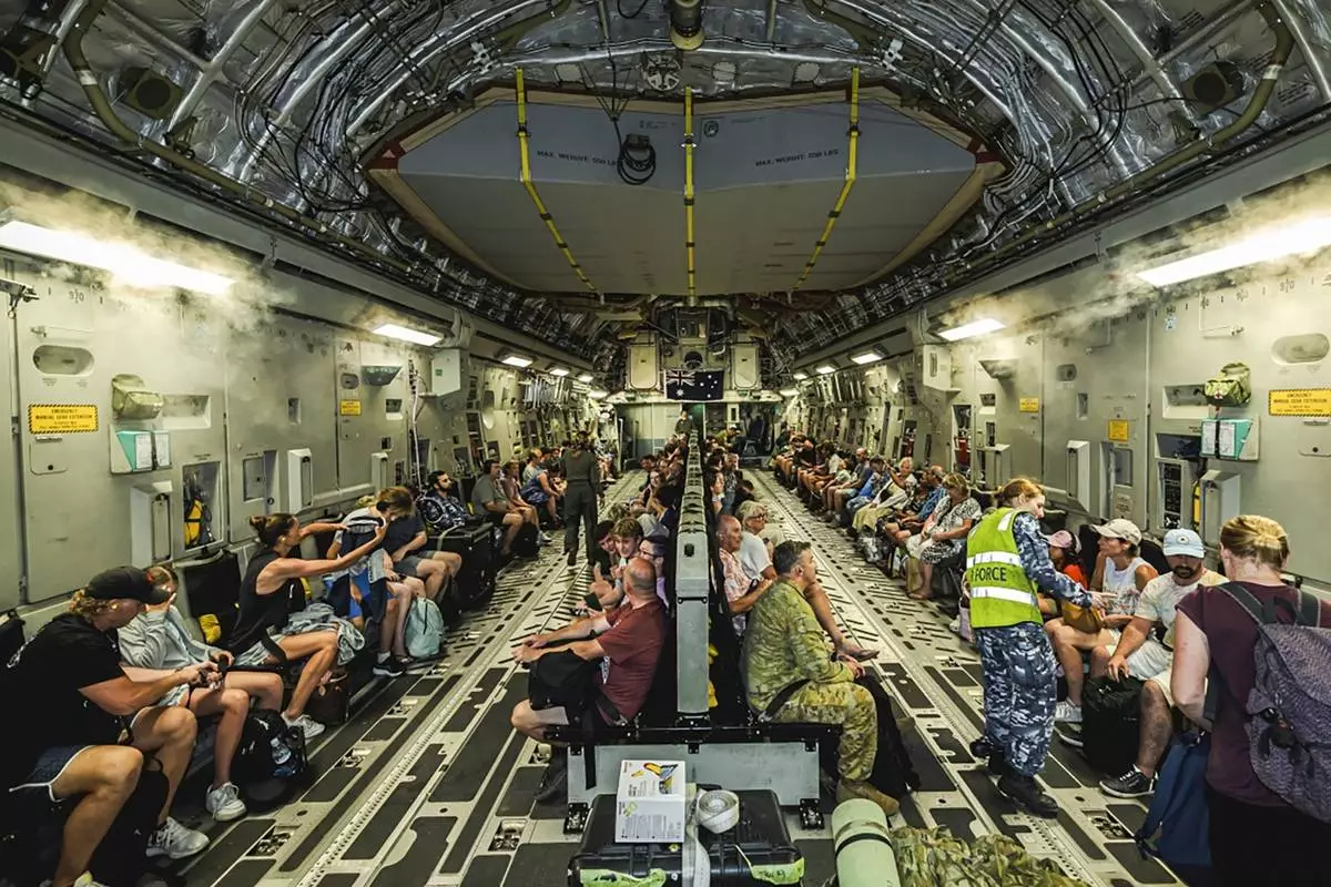 This photo released by Australian Department of Defence, shows Australian citizens on board a Royal Australian Air Force aircraft for a flight home from Bauerfield International Airport, Port Vila, Vanuatu, Wednesday, Dec. 18, 2024 following a powerful earthquake that struck just off the coast of Vanuatu in the South Pacific Ocean. (CPL Adam Abela/Australian Department of Defence via AP)