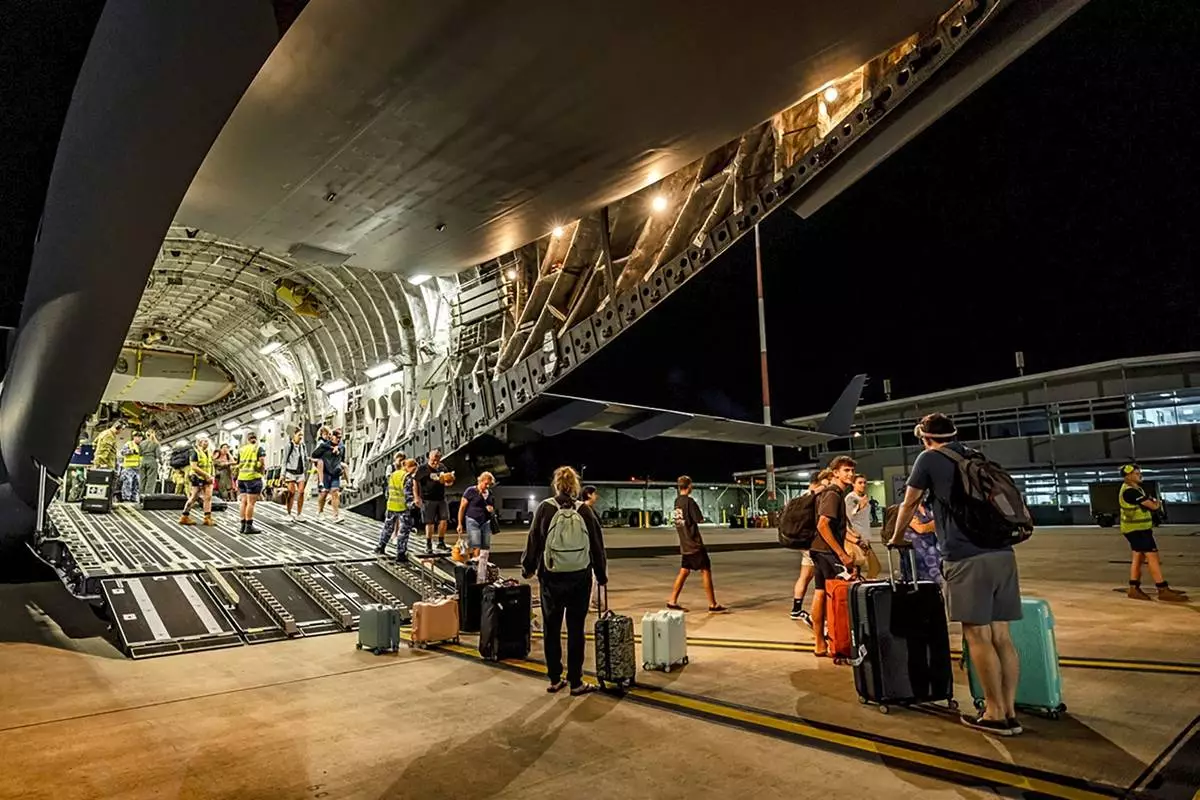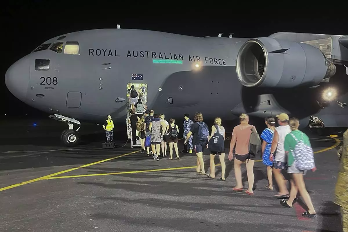 In this photo released by Australia's Department of Foreign Affairs and Trade (DFAT), Australians board a Royal Australian Air Force aircraft in Port Vila, Vanuatu in the early hours of Thursday, Dec. 19, 2024, following a powerful earthquake that struck just off the coast of Vanuatu in the South Pacific Ocean, Tuesday, Dec. 17, 2024. (DFAT via AP)