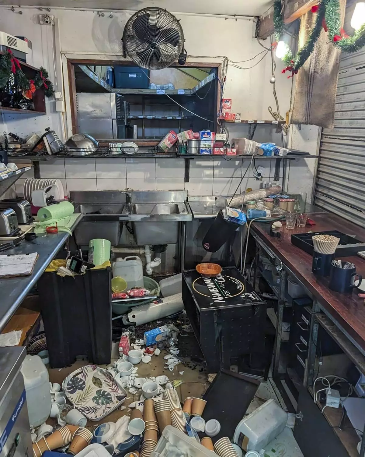 Damage to the inside of the Nambawan Cafe in Port Vila, Tuesday, Dec. 17, 2024, following a strong earthquake that struck just off the coast of Vanuatu in the South Pacific Ocean. (Ivan Oswald via AP)