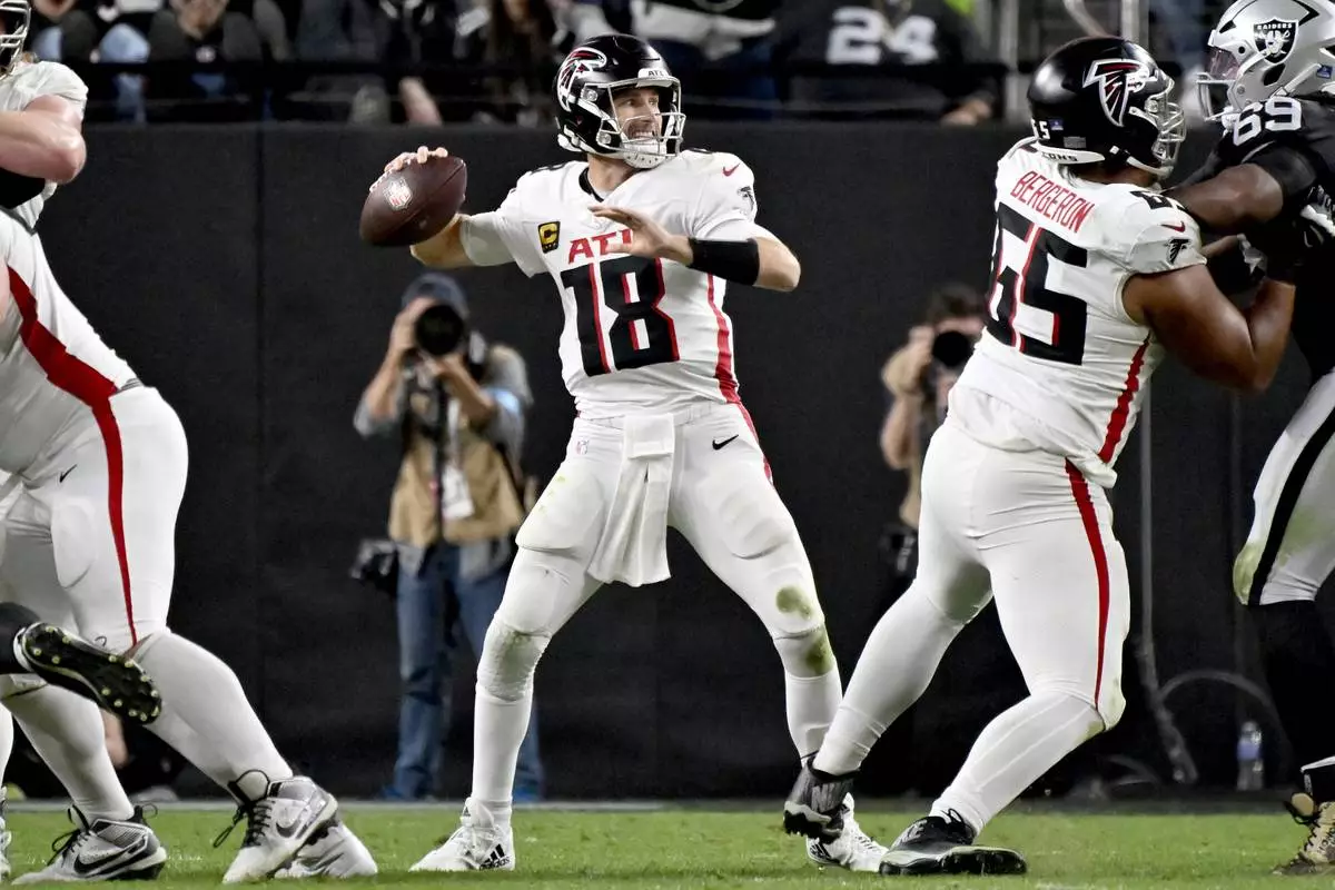 Atlanta Falcons quarterback Kirk Cousins (18) throws against the Las Vegas Raiders during the second half of an NFL football game, Monday, Dec. 16, 2024, in Las Vegas. (AP Photo/David Becker)