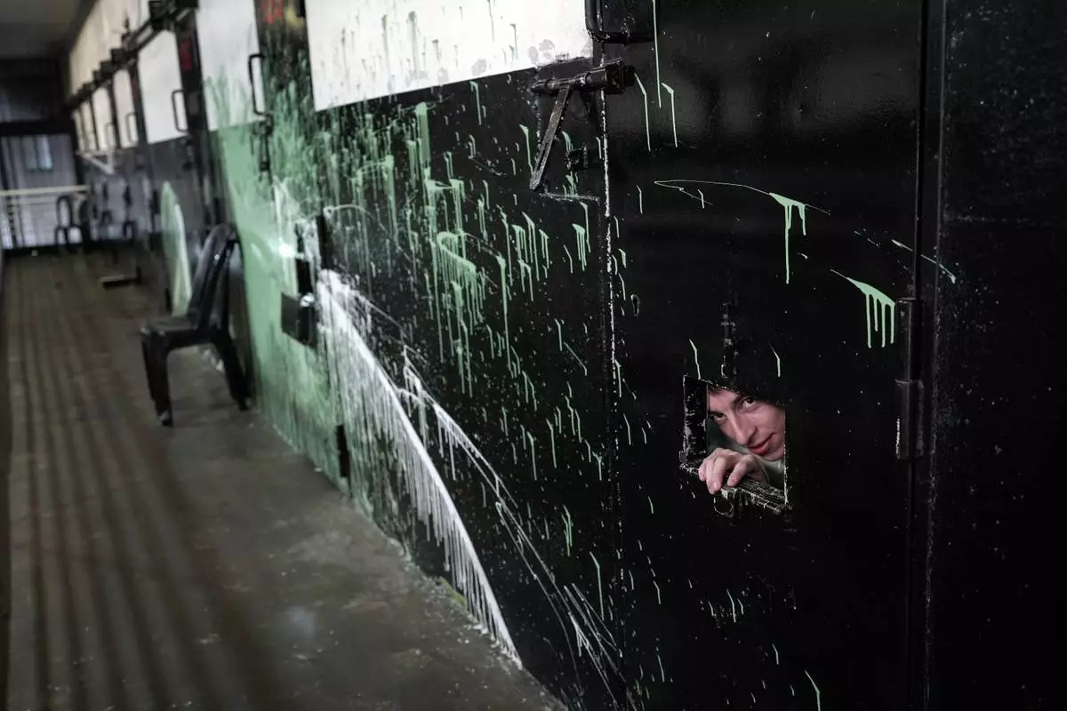 A prisoner peers from his cell as penitentiary agents search the pavilion where the most dangerous gang members are held at the Pinero prison, Rosario, Argentina, Saturday, Sept. 28, 2024. (AP Photo/Rodrigo Abd)