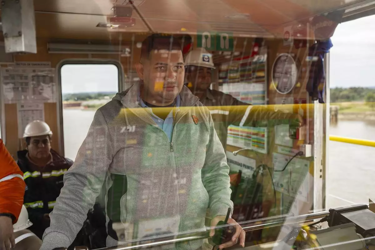 The captain of a cargo ship from the Paraguayan company Paranave works with his crew as they navigate the Paraguay River after leaving the port of Villeta on the outskirts of Asuncion, Paraguay, Thursday, July 11, 2024. (AP Photo/Rodrigo Abd)