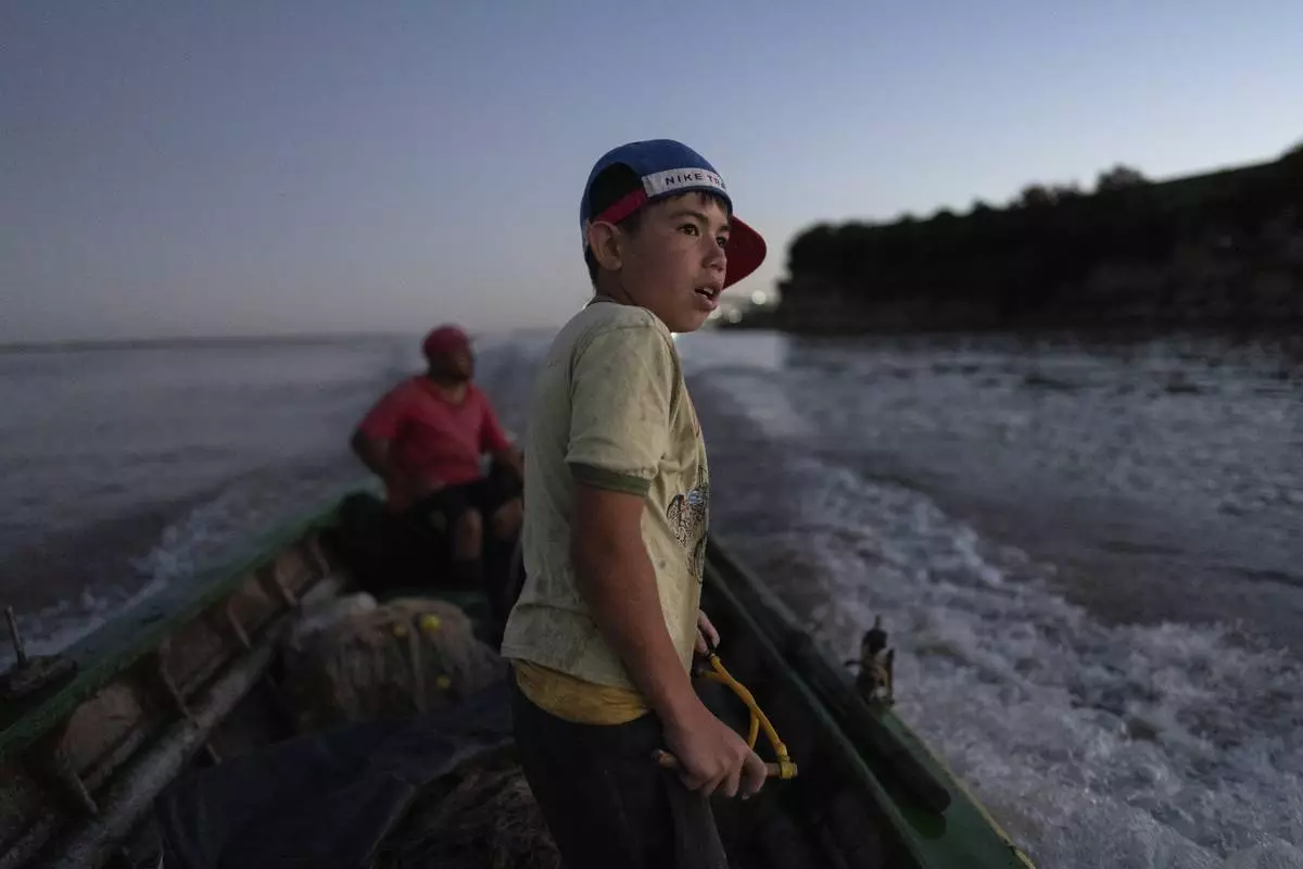 Milo Lautaro Sandoval gets his slingshot ready to hunt pigeons after assisting his neighbor Carlos Andino to fish in the Parana River in Villa Gobernador Galvez, Argentina, Wednesday, Dec. 11, 2024. (AP Photo/Rodrigo Abd)