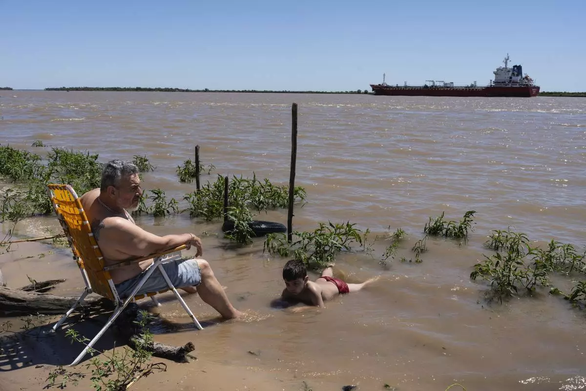 Briceno Medina and his grandfather Gerardo Medina relax on the banks of the Parana River in Villa Gobernador Galvez, Argentina, Wednesday, Dec. 4, 2024. (AP Photo/Rodrigo Abd)