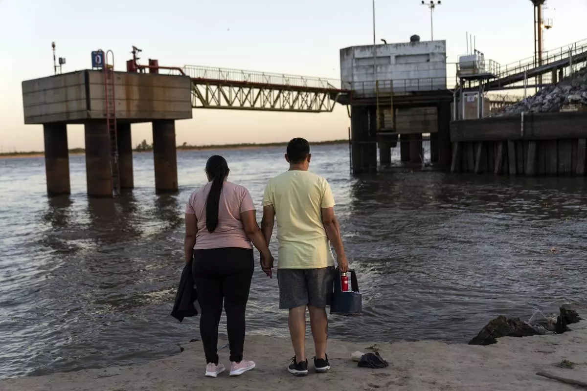 A couple watches the sun set outside an agricultural export port on the banks of the Parana River in Puerto General San Martin, Argentina, Monday, Dec. 2, 2024. (AP Photo/Rodrigo Abd)