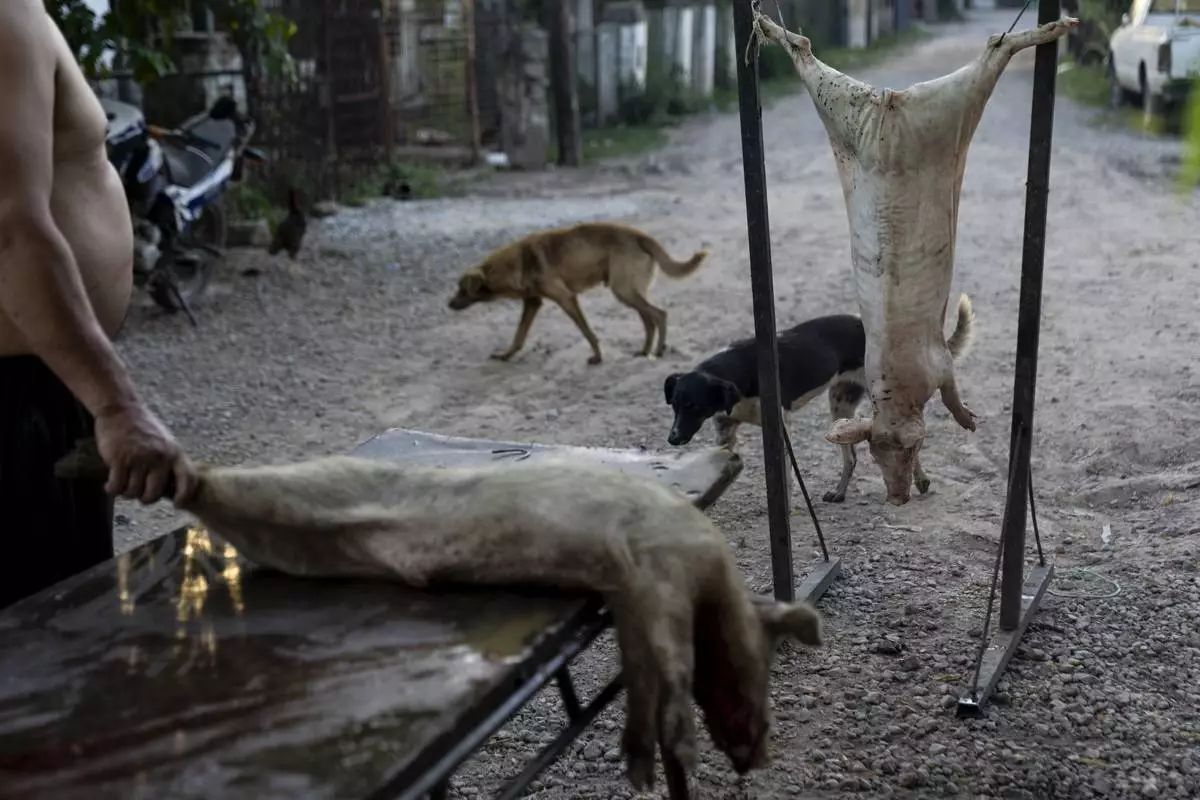 Dante Andino prepares to plunge a dead pig into boiling water in Villa Gobernador Galvez, Argentina, Tuesday, Dec. 10, 2024. (AP Photo/Rodrigo Abd)