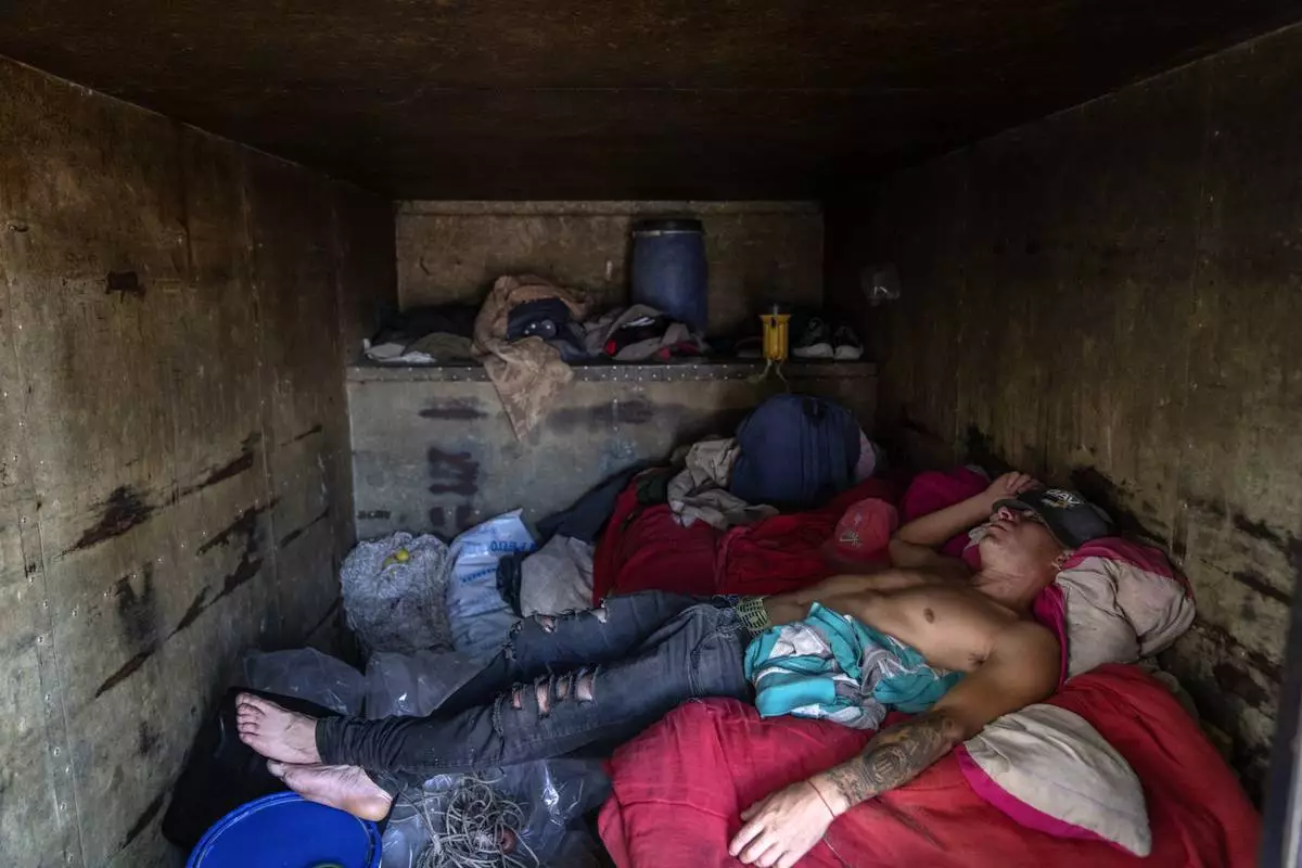 Artisanal fisherman Marcelo Munoz nap inside a container used as a base by fishermen before fishing overnight in the Parana River in Villa Gobernador Galvez, Argentina, Wednesday, Dec. 11, 2024. (AP Photo/Rodrigo Abd