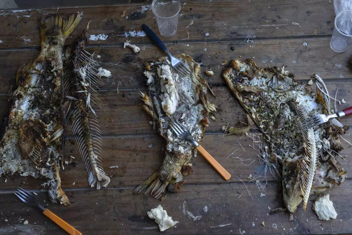 The bones of fish caught in the Parana River lay on the table after being eaten for lunch in Villa Gobernador Galvez, Argentina, Wednesday, Dec. 11, 2024. (AP Photo/Rodrigo Abd)