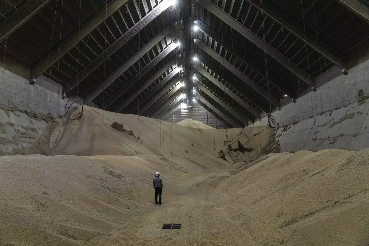 A worker stands in a soybean warehouse at the Molinos Agro agroindustrial complex on the banks of the Parana River in San Lorenzo, Argentina, Tuesday, Dec. 3, 2024. (AP Photo/Rodrigo Abd)