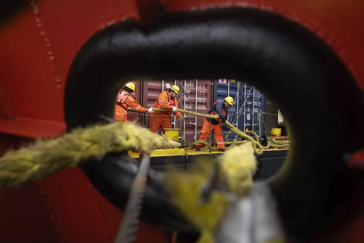 A crew works to release their cargo ship as they leave the port of Villeta, on the outskirts of Asuncion, Paraguay, Thursday, July 11, 2024. (AP Photo/Rodrigo Abd)