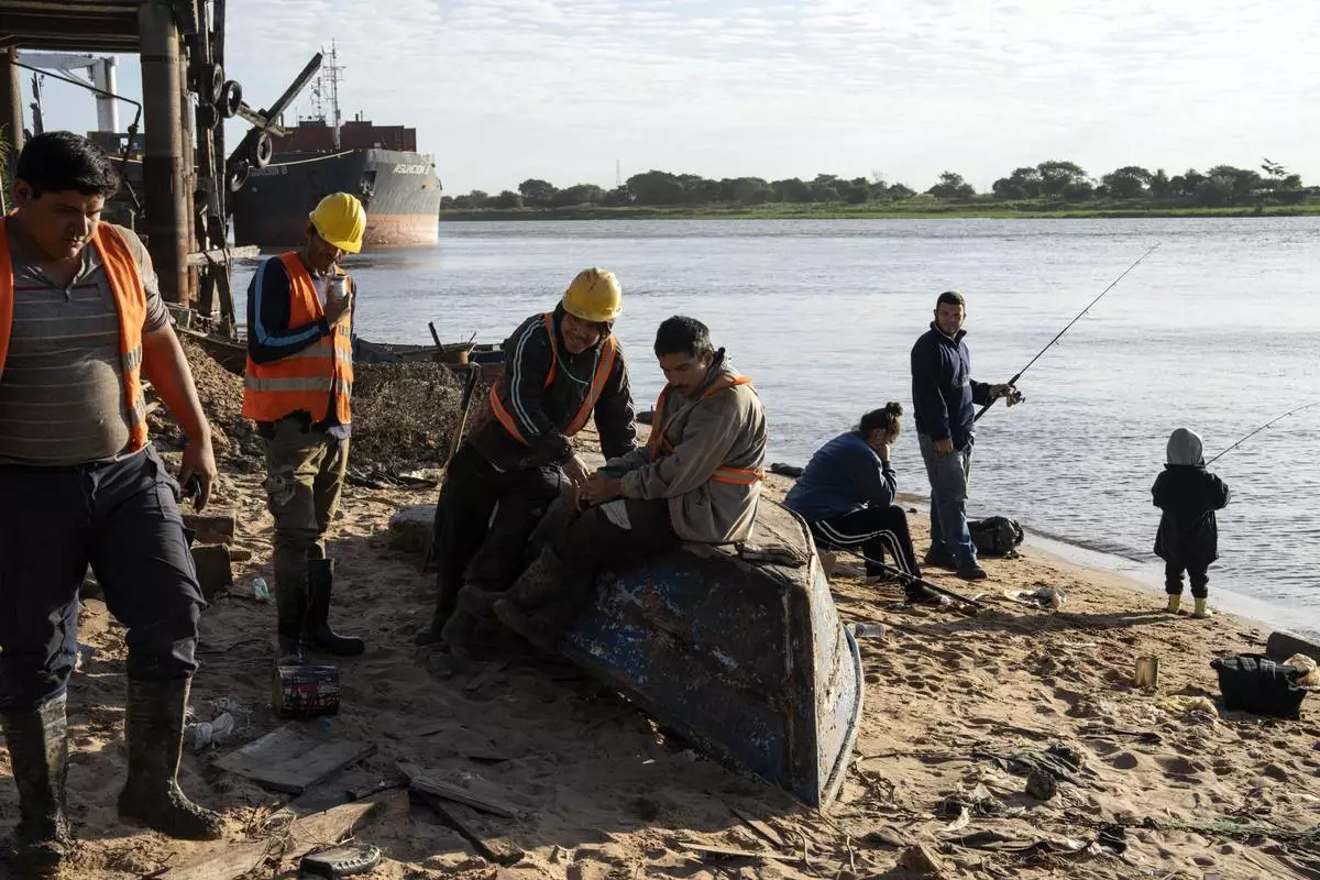 Caacupemi port workers take a break on the Paraguay River in Asuncion, Paraguay, Tuesday, July 9, 2024. (AP Photo/Rodrigo Abd)