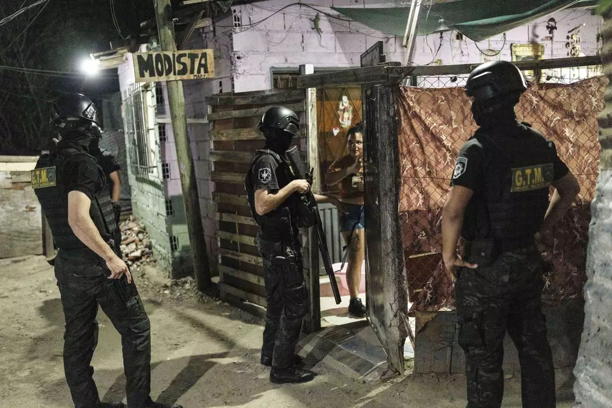 Police officers talk to a woman during an anti-gang operation in the 7 de Septiembre neighborhood of Rosario, Argentina, Tuesday, Nov. 12, 2024. (AP Photo/Rodrigo Abd)