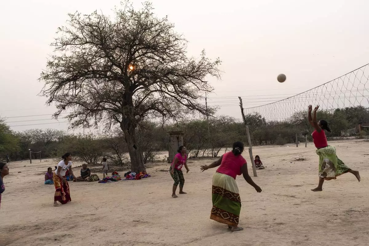 Manjui Indigenous women play volleyball in the Abisai community of Mariscal Estigarribia, in the western region of Paraguay known as the Paraguayan Chaco, Wednesday, Aug. 28, 2024. (AP Photo/Rodrigo Abd)