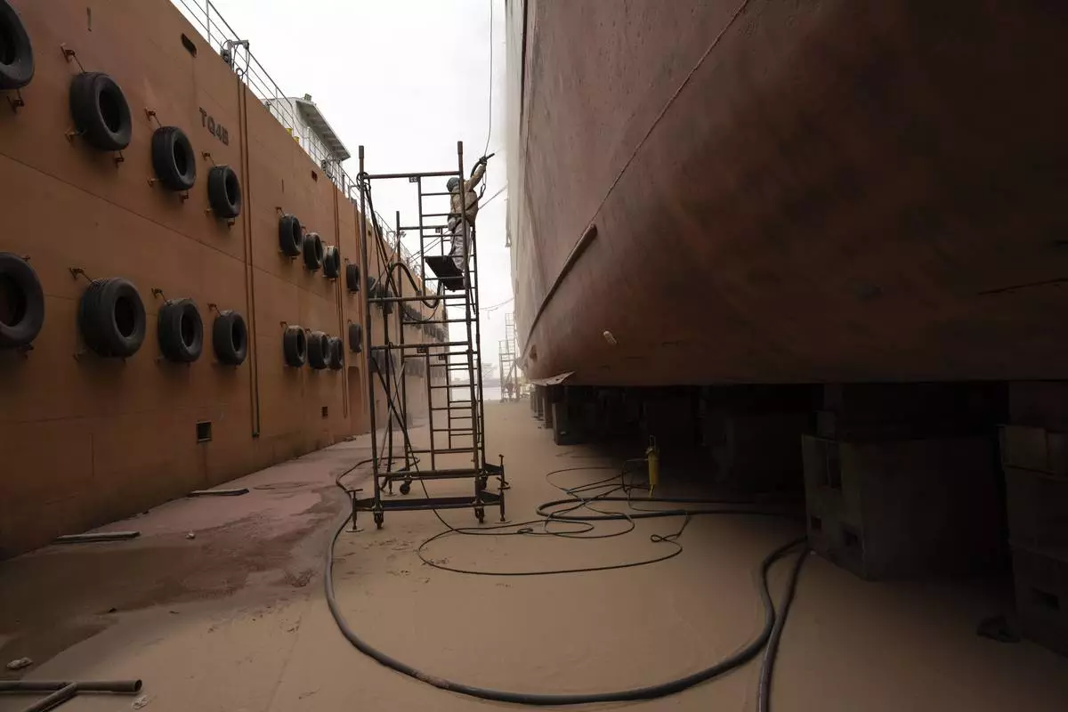 A worker repairs a wall on a ship at La Barca del Pescador shipyard on the banks of the Paraguay River in the port of Villeta on the outskirts of Asuncion, Paraguay, Thursday, July 11, 2024. (AP Photo/Rodrigo Abd)