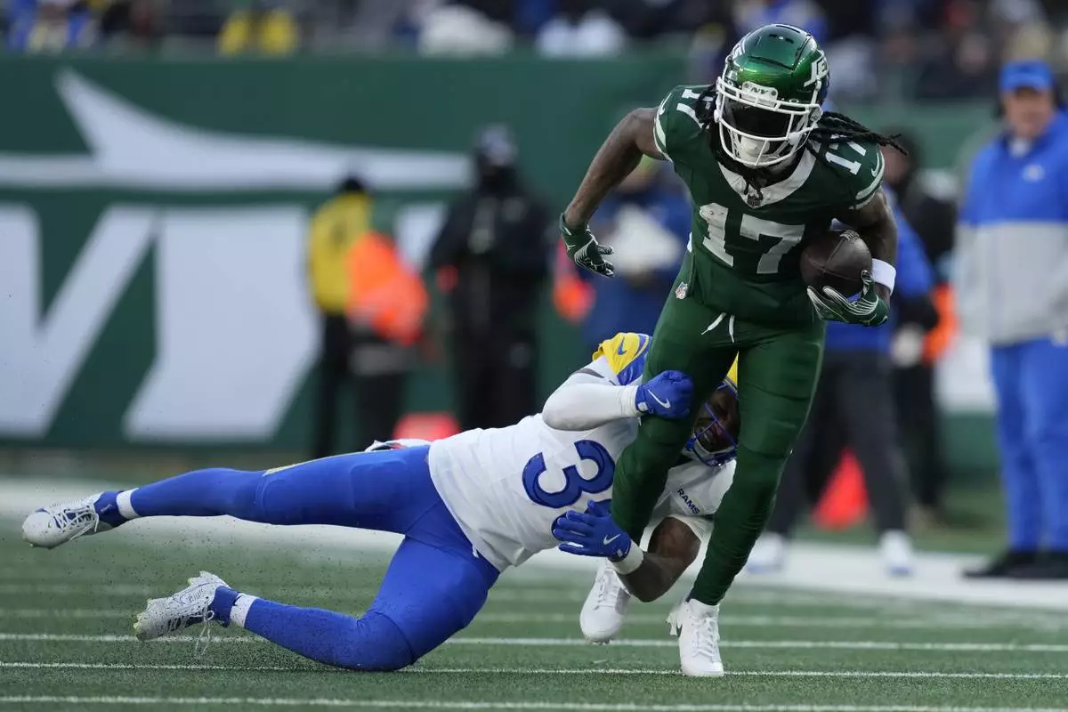 New York Jets wide receiver Davante Adams (17) runs against Los Angeles Rams safety Jaylen McCollough during the first half of an NFL football game in East Rutherford, N.J., Sunday, Dec. 22, 2024. (AP Photo/Julia Demaree Nikhinson)