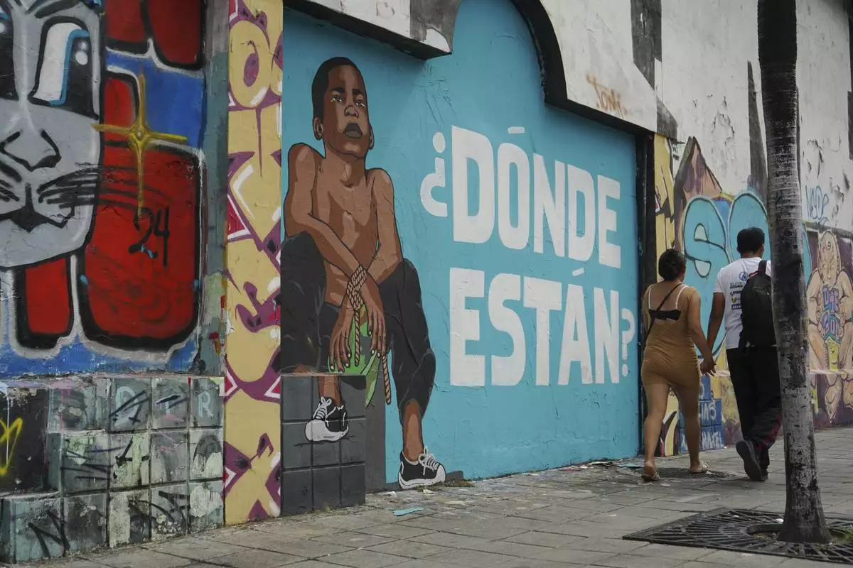 A mural of a child and the Spanish message "Where are they?" cover a wall in protest of the disappearance of four children who were last seen on Dec. 8 running away from a military convoy in Guayaquil, Monday, Dec. 23, 2024. (AP Photo/Cesar Munoz)