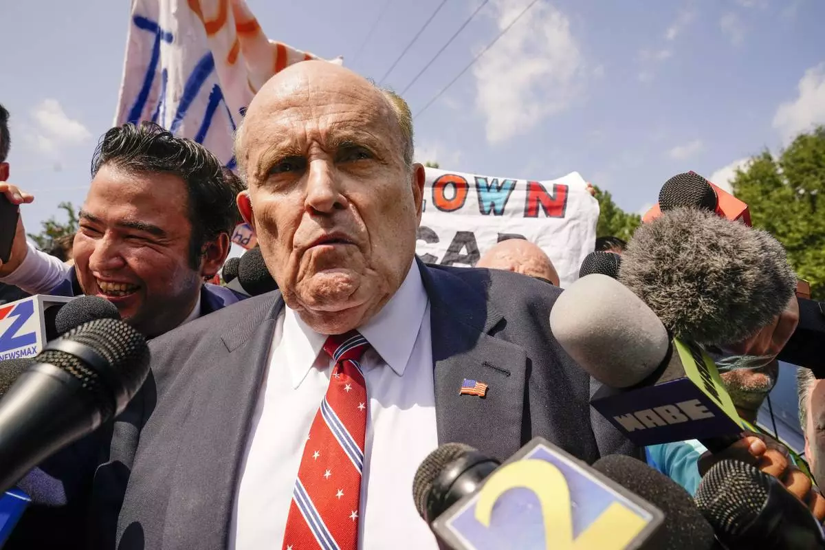 FILE - Rudy Giuliani speaks outside the Fulton County jail in Atlanta, on Wednesday, Aug. 23, 2023. (AP Photo/Brynn Anderson, File)