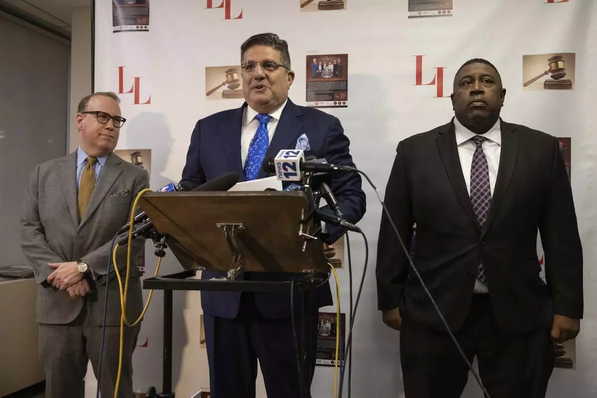 Former NYPD Chief of Department Jeffrey Maddrey, right, and attorney Lambros Lambrou, center, attend a press conference, Friday, Dec. 27, 2024, in New York. (AP Photo/Yuki Iwamura)