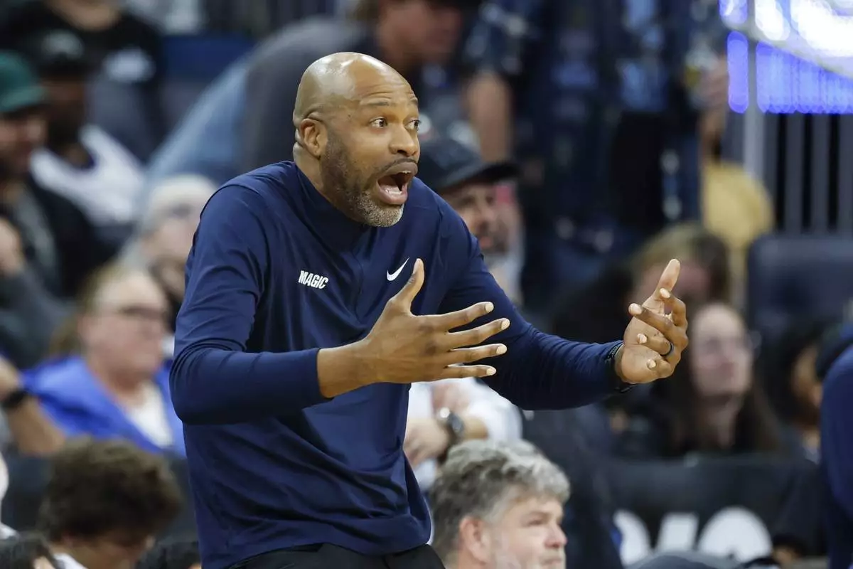 Orlando Magic head coach Jamahl Mosley reacts as his team plays the Miami Heat during the second half of an NBA basketball game, Thursday, Dec. 26, 2024, in Orlando, Fla. (AP Photo/Kevin Kolczynski)