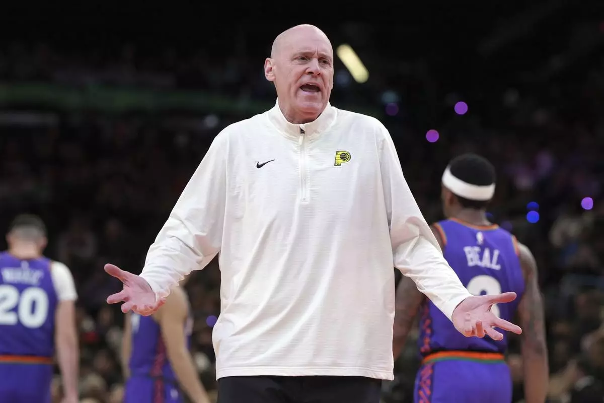 Indiana Pacers head coach Rick Carlisle reacts after a foul call during the second half of an NBA basketball game against the Phoenix Suns, Thursday, Dec. 19, 2024, in Phoenix. (AP Photo/Rick Scuteri)