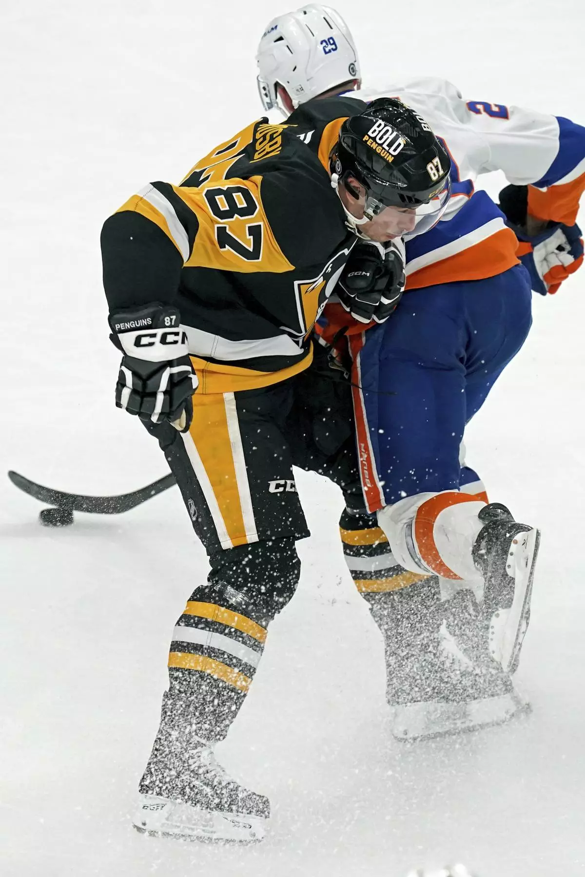 Pittsburgh Penguins' Sidney Crosby (87) collides with New York Islanders' Brock Nelson (29) during the first period of an NHL hockey game Sunday, Dec. 29, 2024, in Pittsburgh. (AP Photo/Matt Freed)
