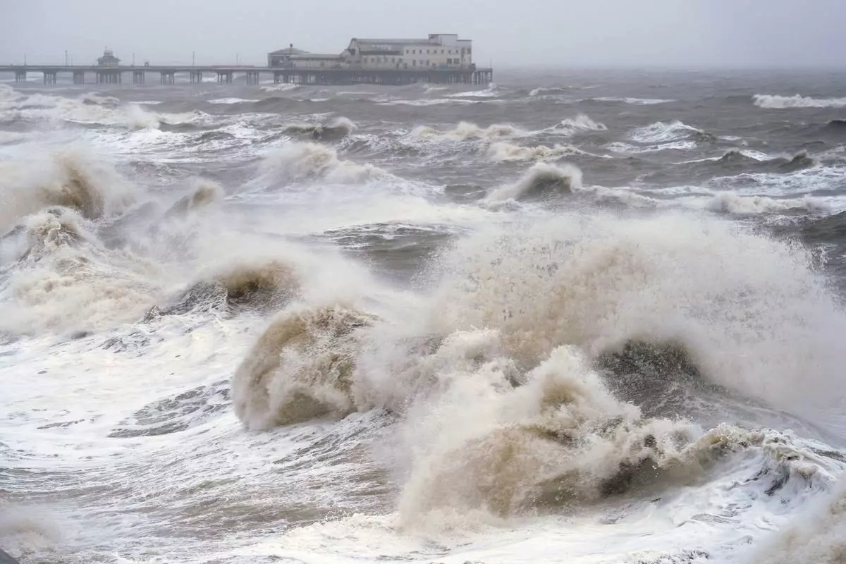 Waves break on the sea front in Blackpool, as snow, rain and wind warnings are in force and are expected to cause travel issues on New Year's Eve on Tuesday, Dec. 31, 2024. (Peter Byrne/PA via AP)