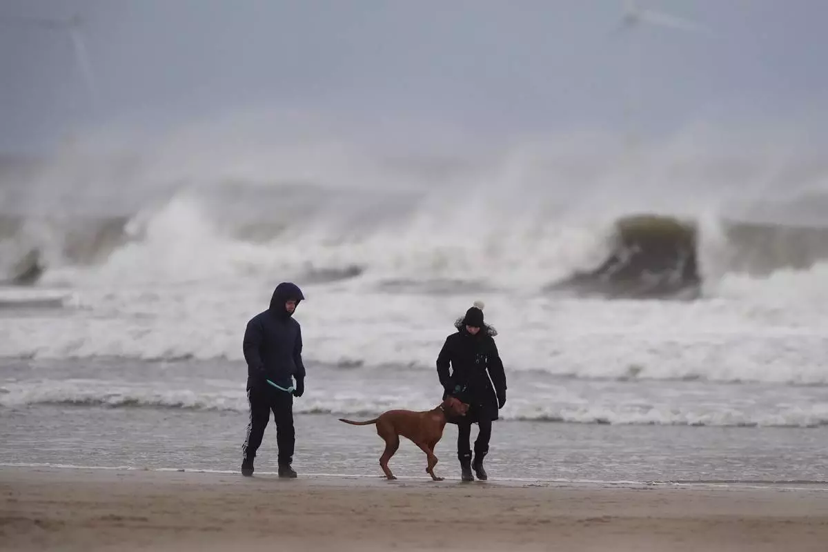 Dog walkers in the wind on Tynemouth Longsands on the North East coast in Newcastle, England, Tuesday, Dec. 31, 2024. (Owen Humphreys/PA via AP)